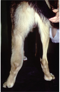 Anhidrotic ectodermal dysplasia is an inherited disease affecting German shepherd dogs. This disease most commonly presents at birth. Affected dogs are born with symmetrical hairlessness on the forehead and the area over the lower back. Malformed and/or absent teeth (oligodontia) are also a feature of the disorder. Dogs may also have an inability to sweat (anhidrosis) due to missing or abnormal sweat glands. Tear production can be abnormal and dogs often develop dry eye (keratoconjuncitivitis sicca). Affected dogs are more prone to respiratory infections than other dogs and frequently have chronic nasal discharge. Prognosis for survival to adulthood is good. However, affected dogs should be monitored for signs of respiratory infections (cough, rapid or difficult breathing, and exercise intolerance) as they are fatal in rare cases.
