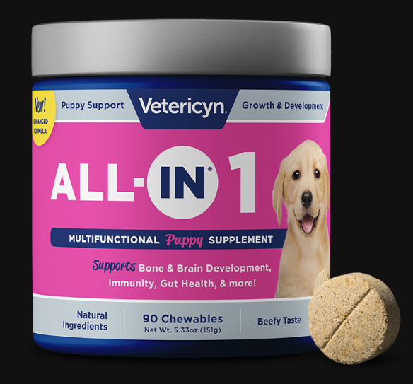 It adds probiotics into the diet to keep that puppy tummy happy.